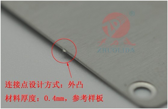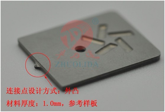 外凸試連接點設計主要是應用于標牌,手機外殼,產品的外殼等表面鍵,外觀看上去不可有毛邊、凹點等缺陷。外凸試計也有兩種方式,一種是材料厚度大于0.3時,連接點可以設計為正面半刻,背面才有連接點,方便打磨等方式去掉;另一種是厚度小于0.3時,連接點不可半刻,以下圖紙是第一種設計方案!