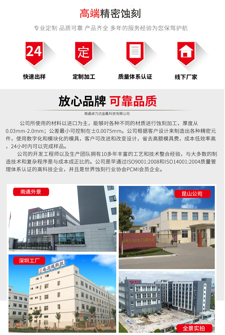 卓力達從事精密蝕刻行業已二十多年,擁有多條不銹鋼腐蝕加工生產線,和多家500強企業合作.免費提供腐蝕加工工藝解決方案,24小時服務:0513-81601666.公司所使用的材料以進口為主,能夠對各種不同的材質進行腐蝕加工,厚度從0.02mm-2.0mm;公差可控制在±0.01mm.